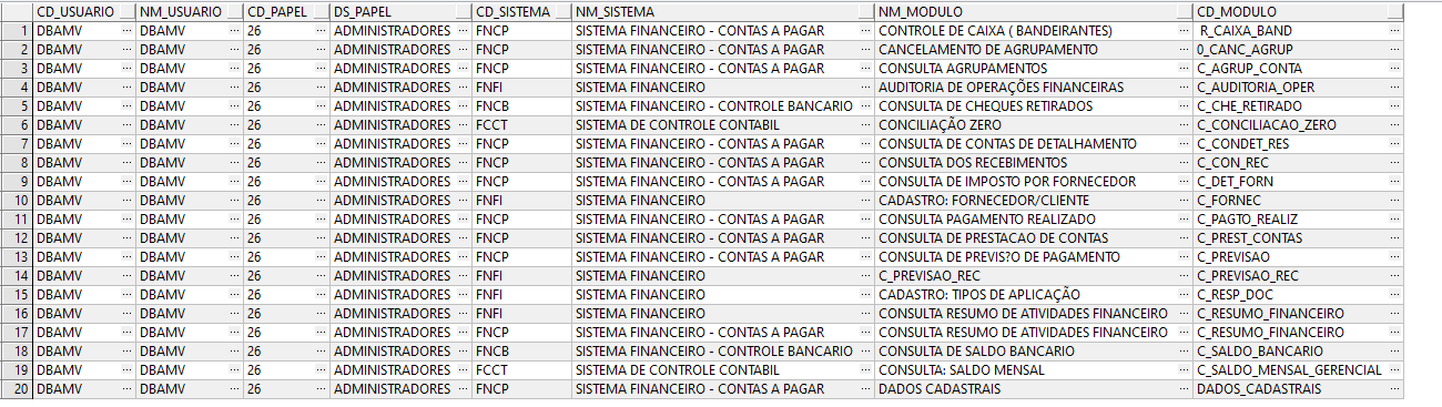 Olá, pessoal. Compartilhar com vocês um script que desenvolvi para atender uma demanda interna, onde se consegue enxergar o nível de acesso do usuário, papel, sistema e tela. Script bastante útil para otimizar tarefas de auditoria de acesso. Abaixo deixo print.